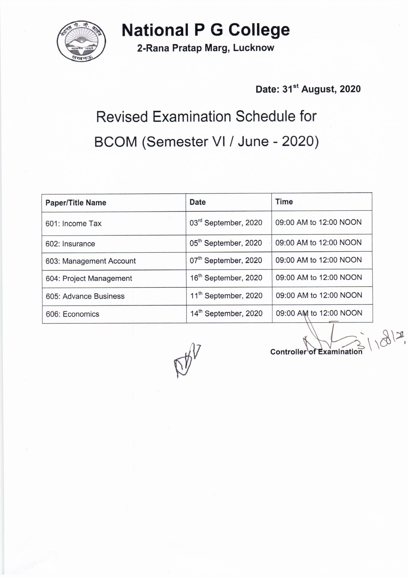 Revised Examination Schedule for B.Com Sem VI (June-2020)