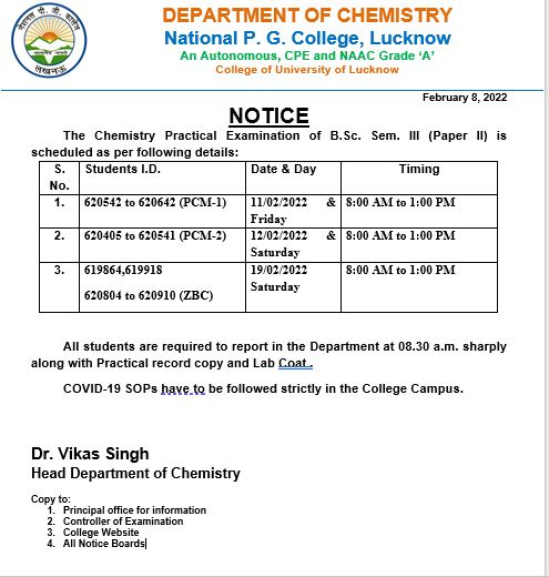 Notice for B.Sc. 3rd Semester Chemistry Practical Examination