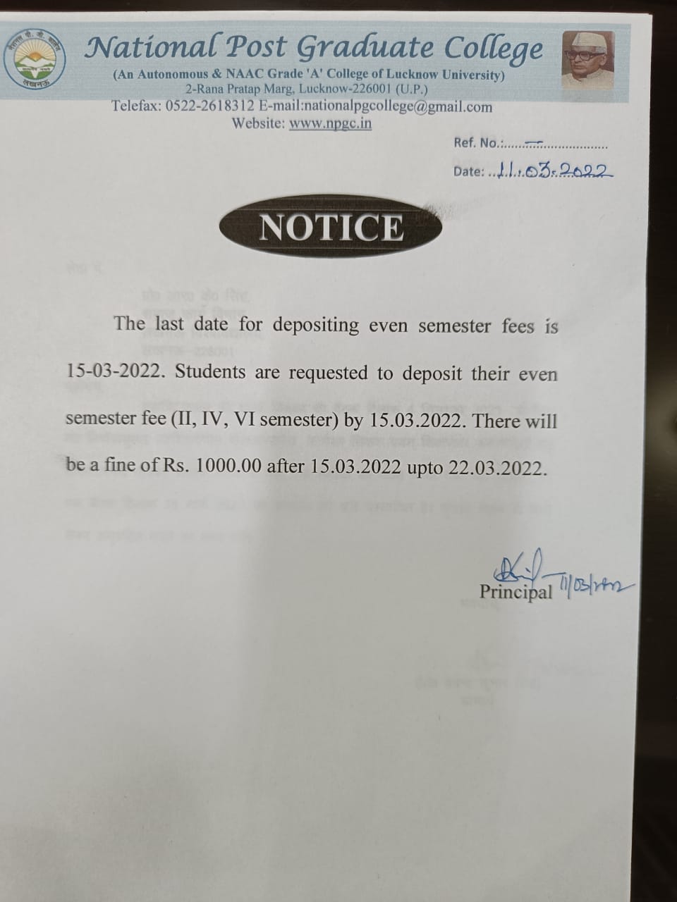 Session 2021-22 : Last Date for depositing even semester fees