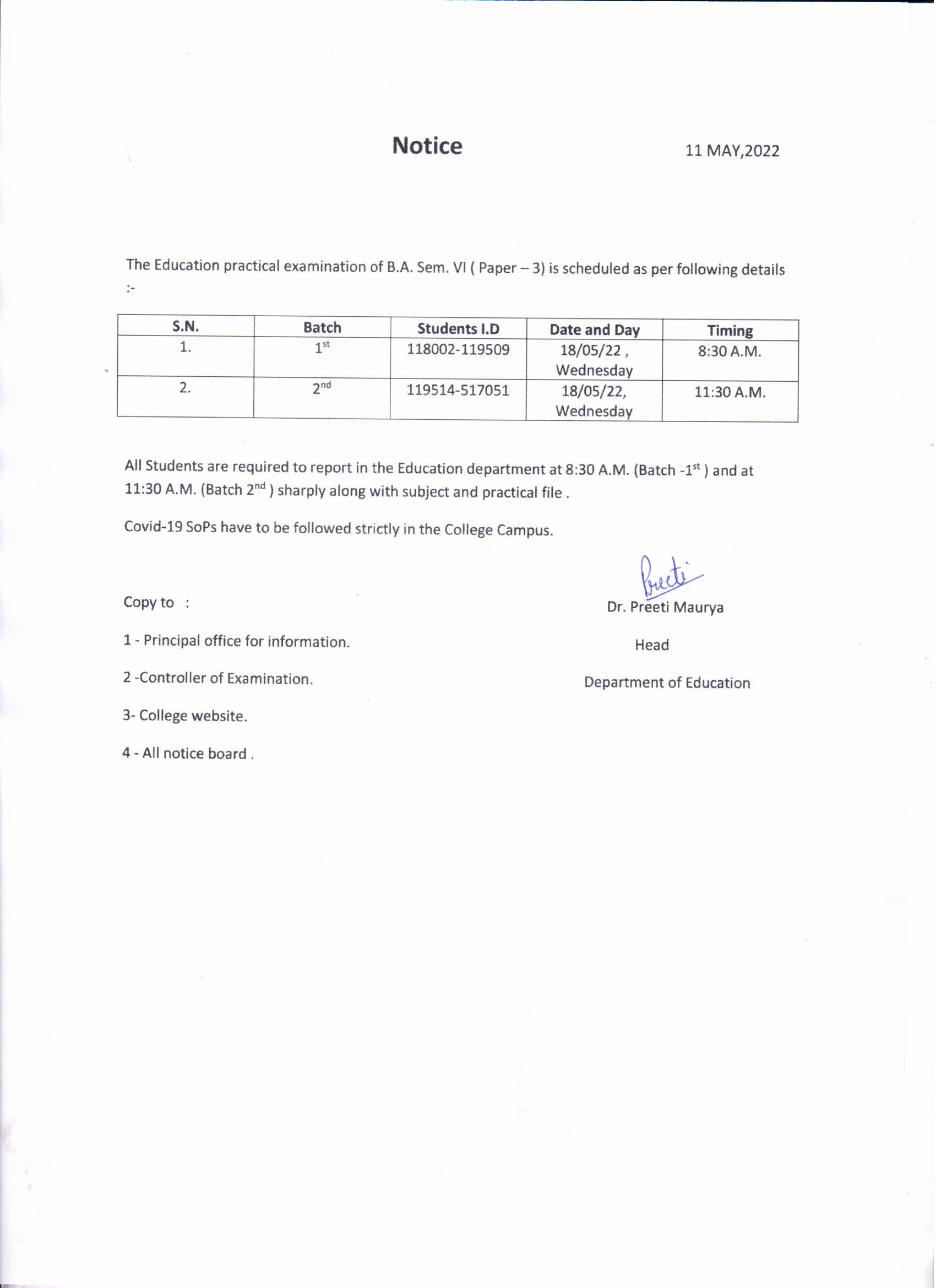 Education Practical Examination Notice for B.A. VI