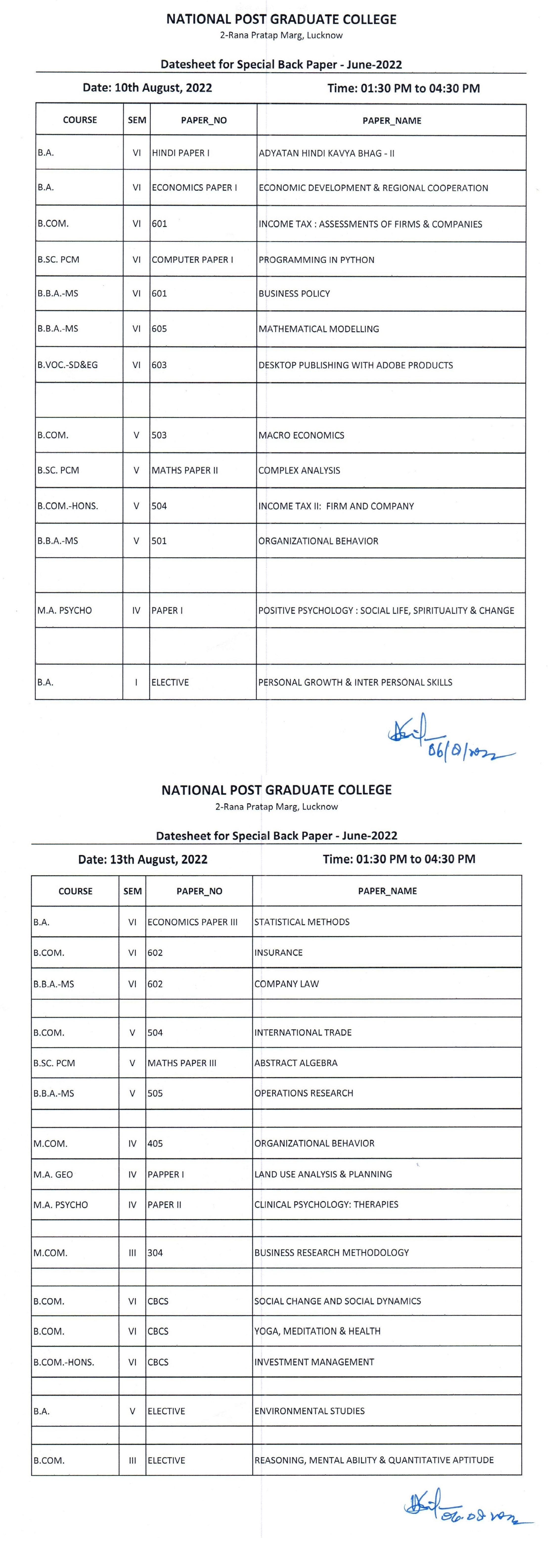 Special Back Paper Examination Datesheet - 2022