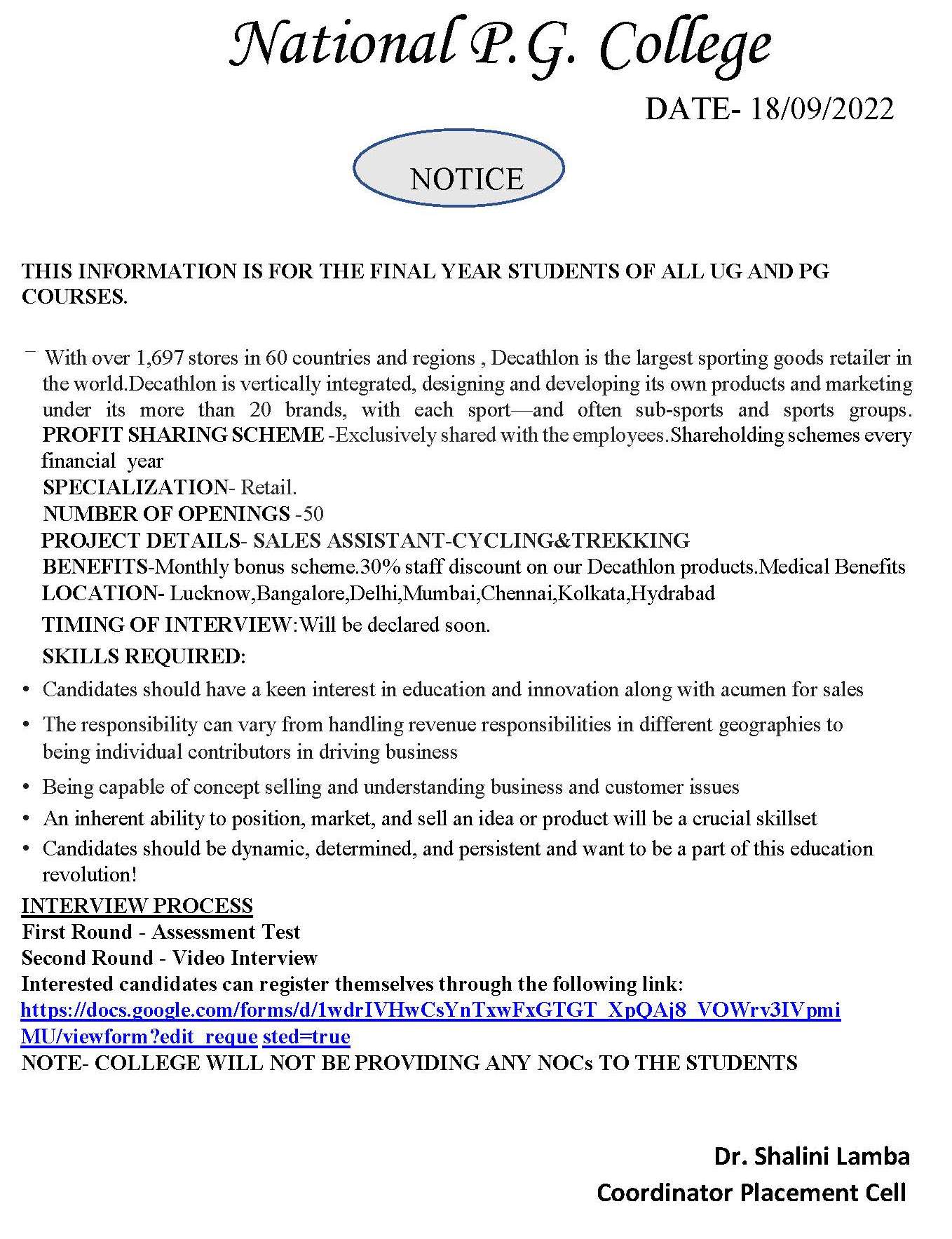 Placement Notice: Decathlon Internship 20 September, 2022 https://docs.google.com/forms/d/1wdrIVHwCsYnTx--wFxGTGT_XpQAj8_VOWrv3IVpmiMU/viewform?edit_requested=true