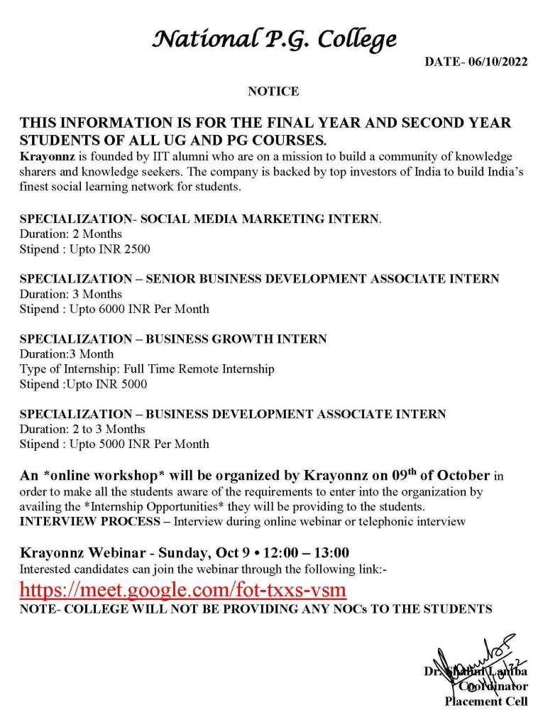 Placement Notice : Krayonnz Internship