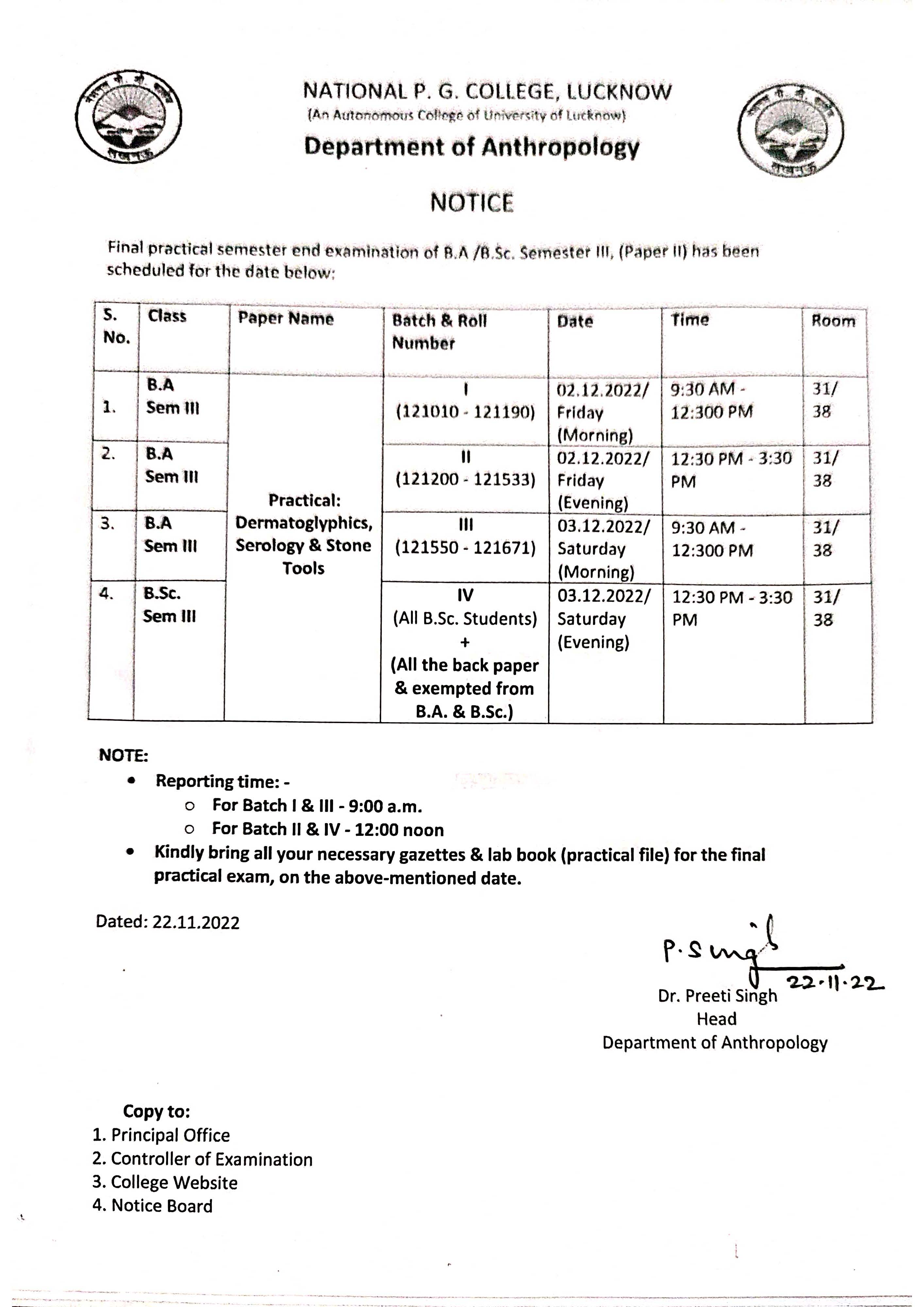 Anthropology Practical Exam Notice (BA & BSC IIIrd Semester)