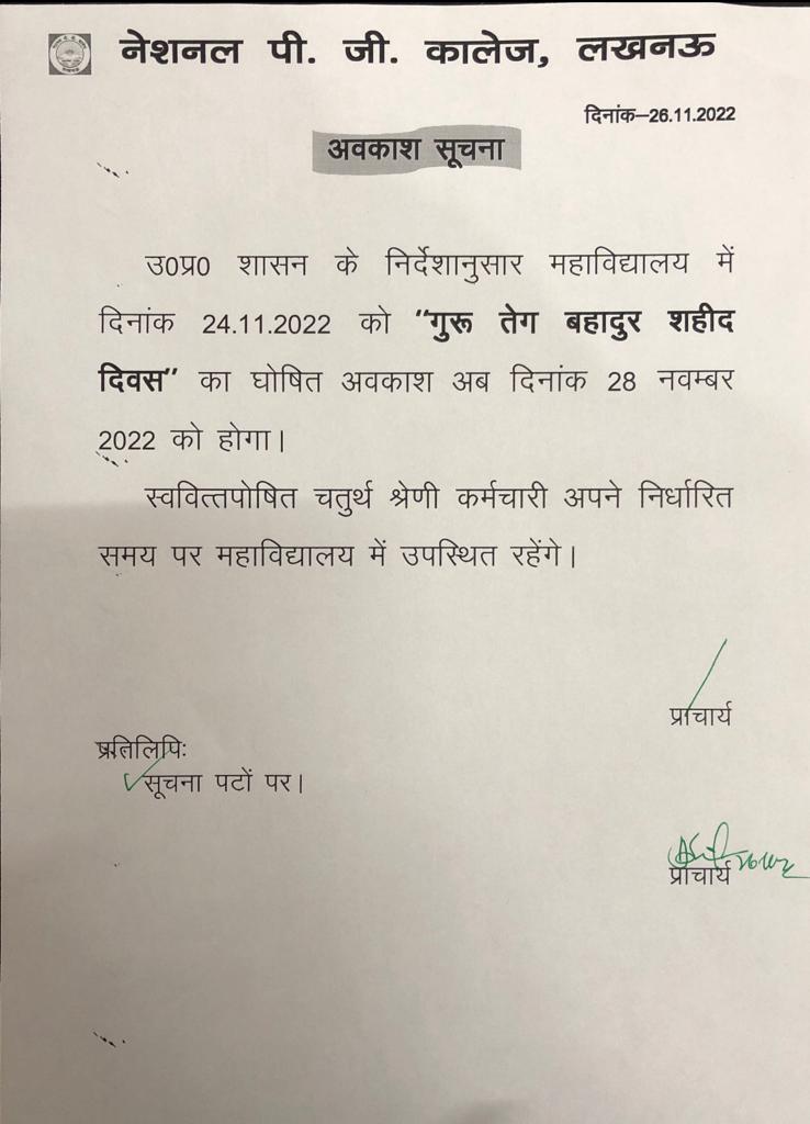 Holiday Notice : गुरु तेग बहादुर शहीद दिवस