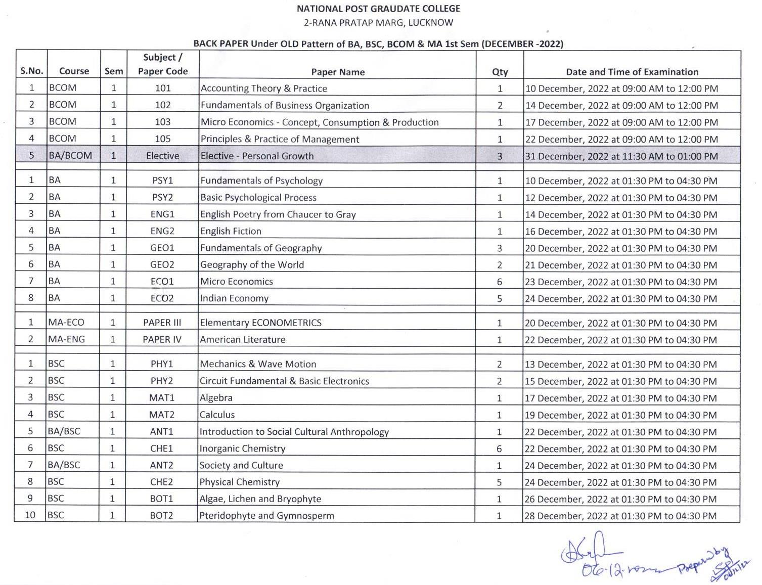 Semester-End Examination Datesheet : December-2022 (Backpaper)