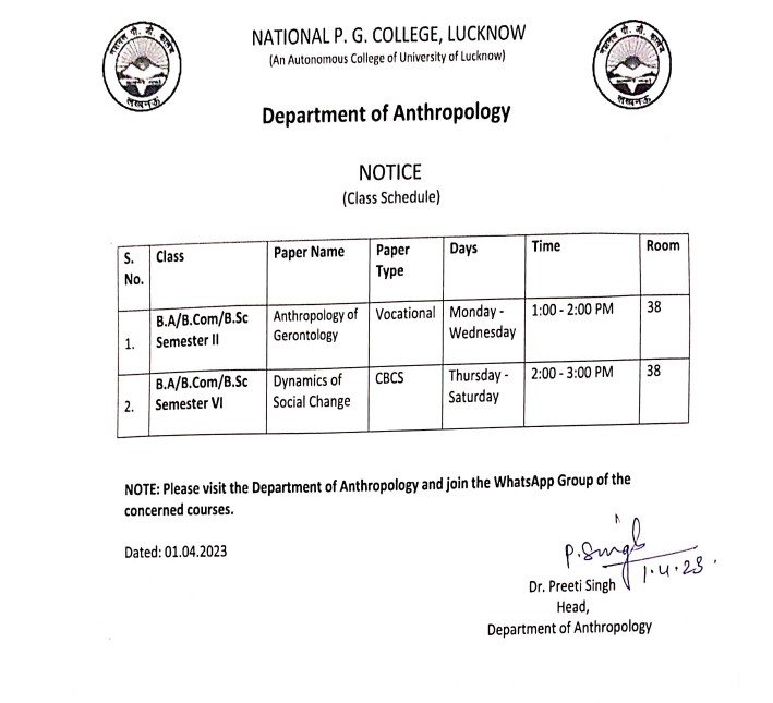 Anthropology Class Schedule : Vocational Sem II & CBCS Sem VI