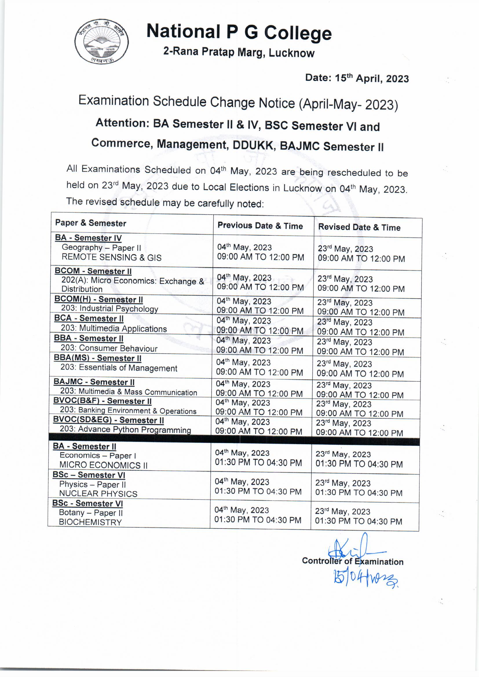 Examination Schedule Change Notice