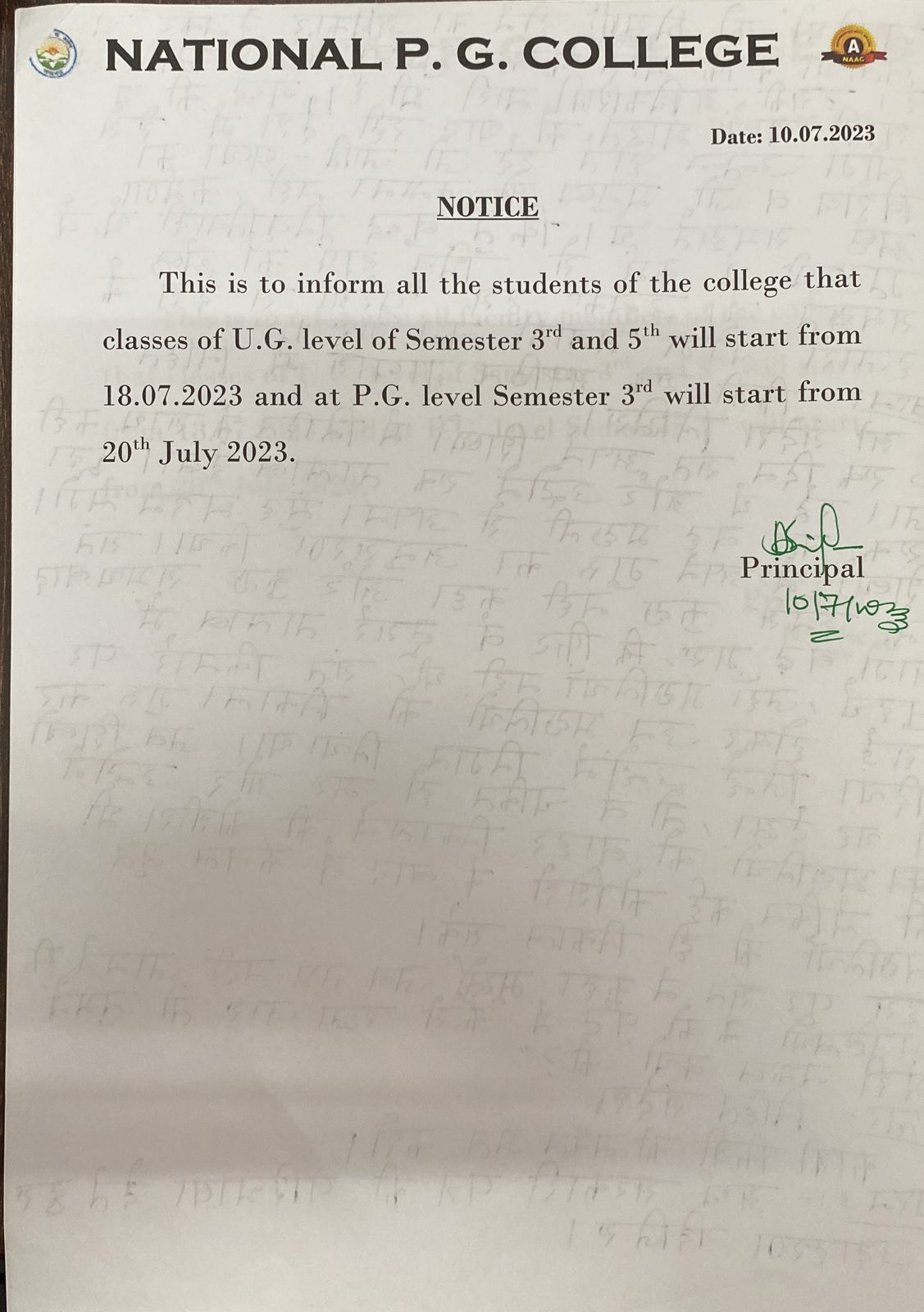 Commencement of classes for semester III & V