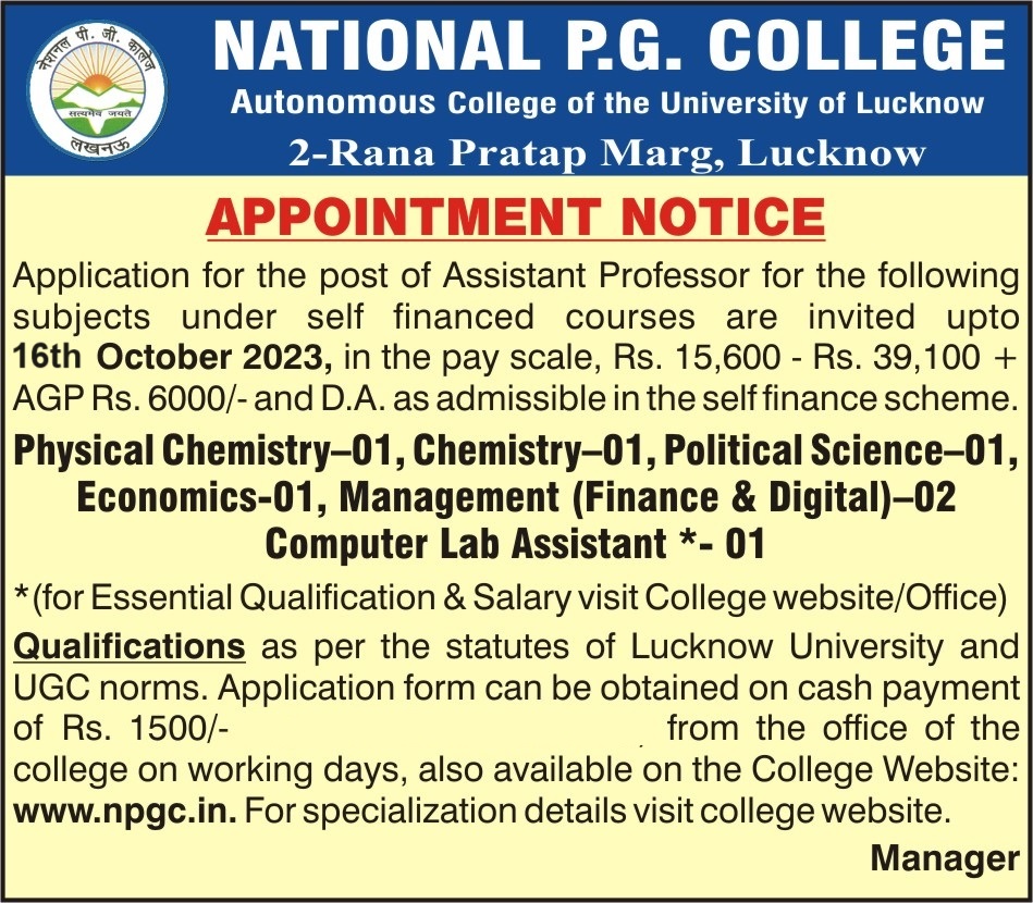 Online Forms must accompany demand draft for ₹ 1500.00 in favour of National P.G. College or the applicant may deposit ₹ 1500.00 in the college office and attach the cash receipt with the application form.Last date for submission has been extended to 20th Oct 2023.