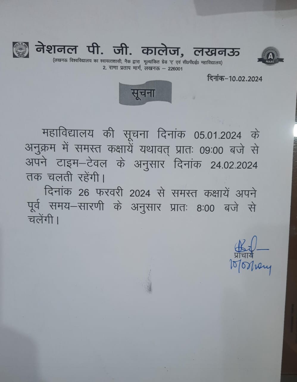 Notice regarding Classes Timings