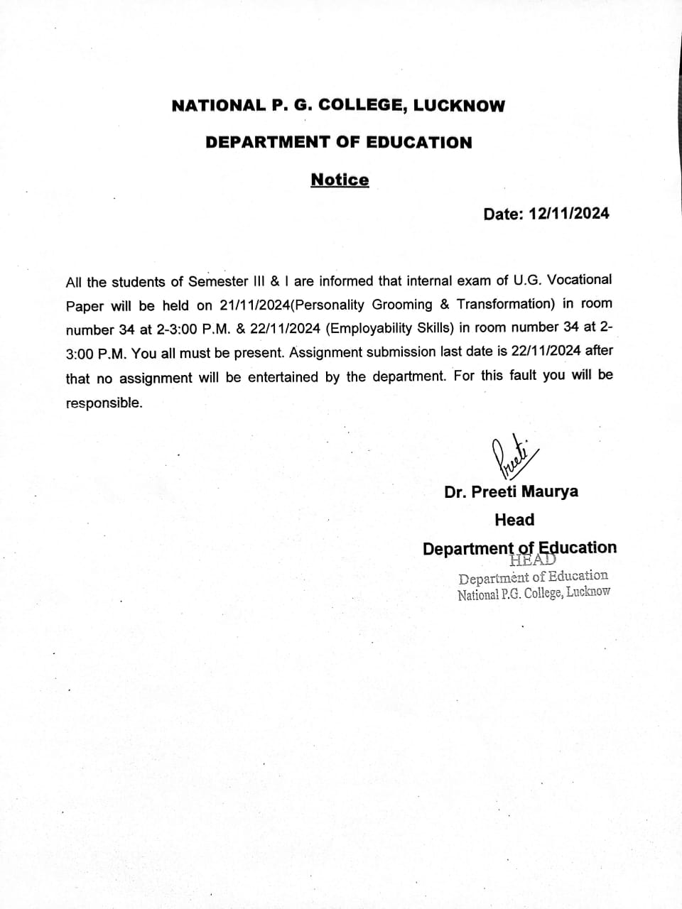 Notice regarding Vocational exam of Semester 1 & 3 education department