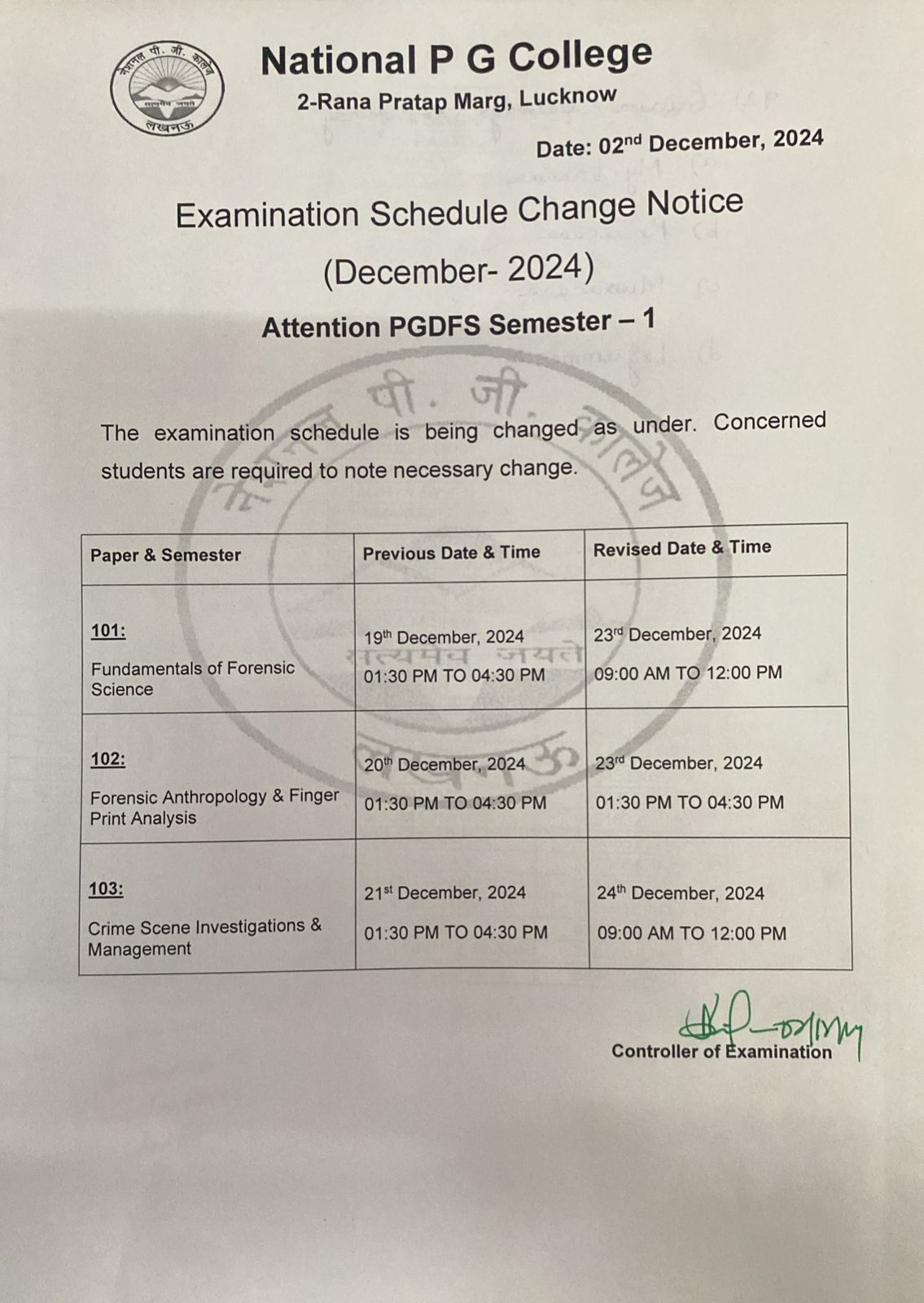 Examination Schedule Change Notice (DEC-2024) - PGDFS Semester -1