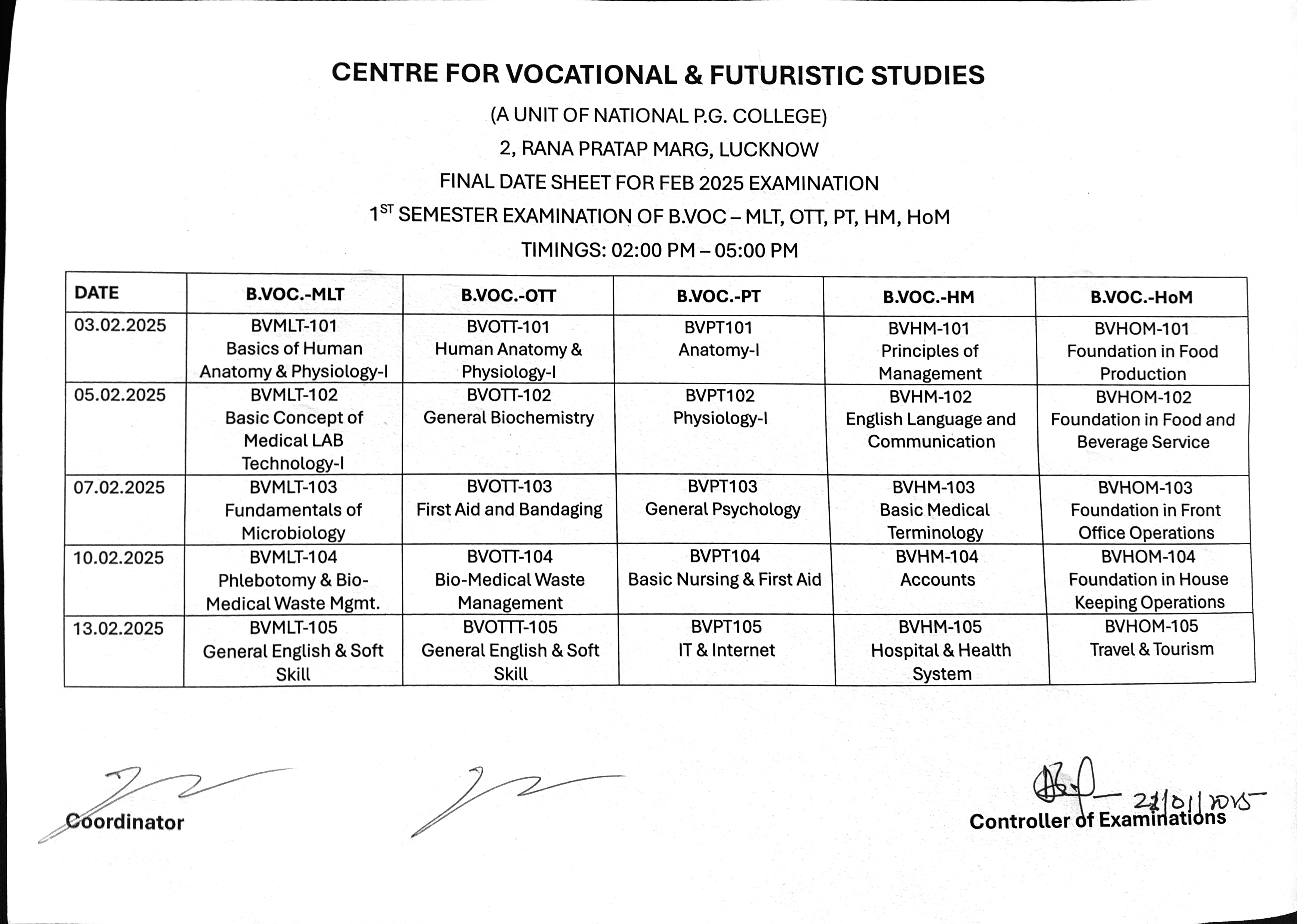 Examination Datesheet: B.Voc. - MTL, PT, HM, HoM & OTT
