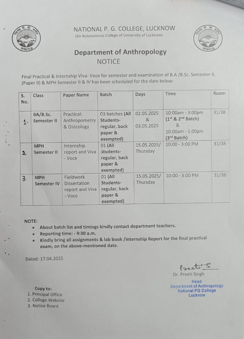 Practical & Internship Notice from Anthropology Department