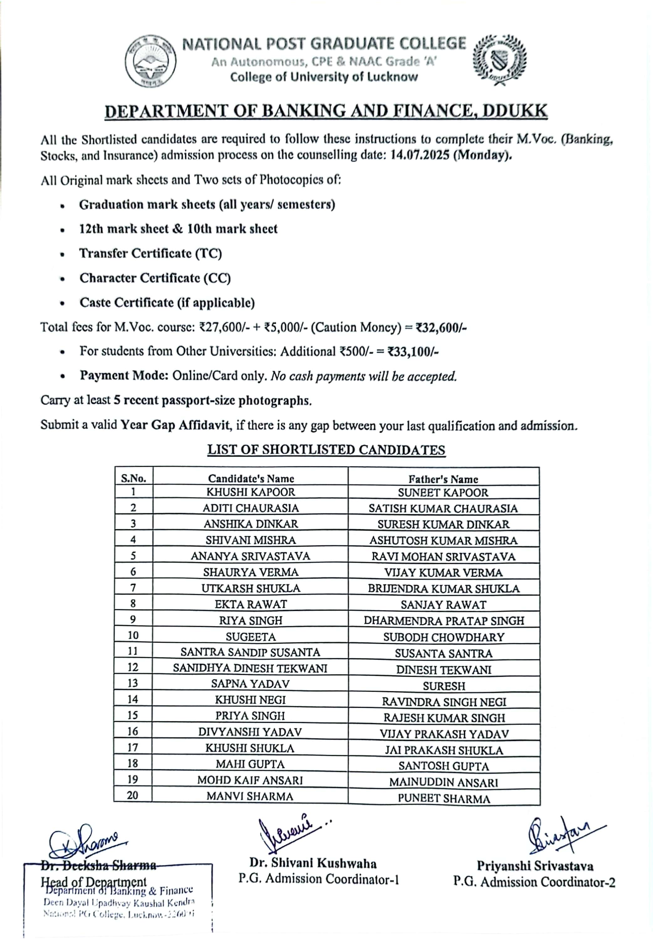 Admission: Merit list of M.Voc. (Banking, Stock & Insurance)