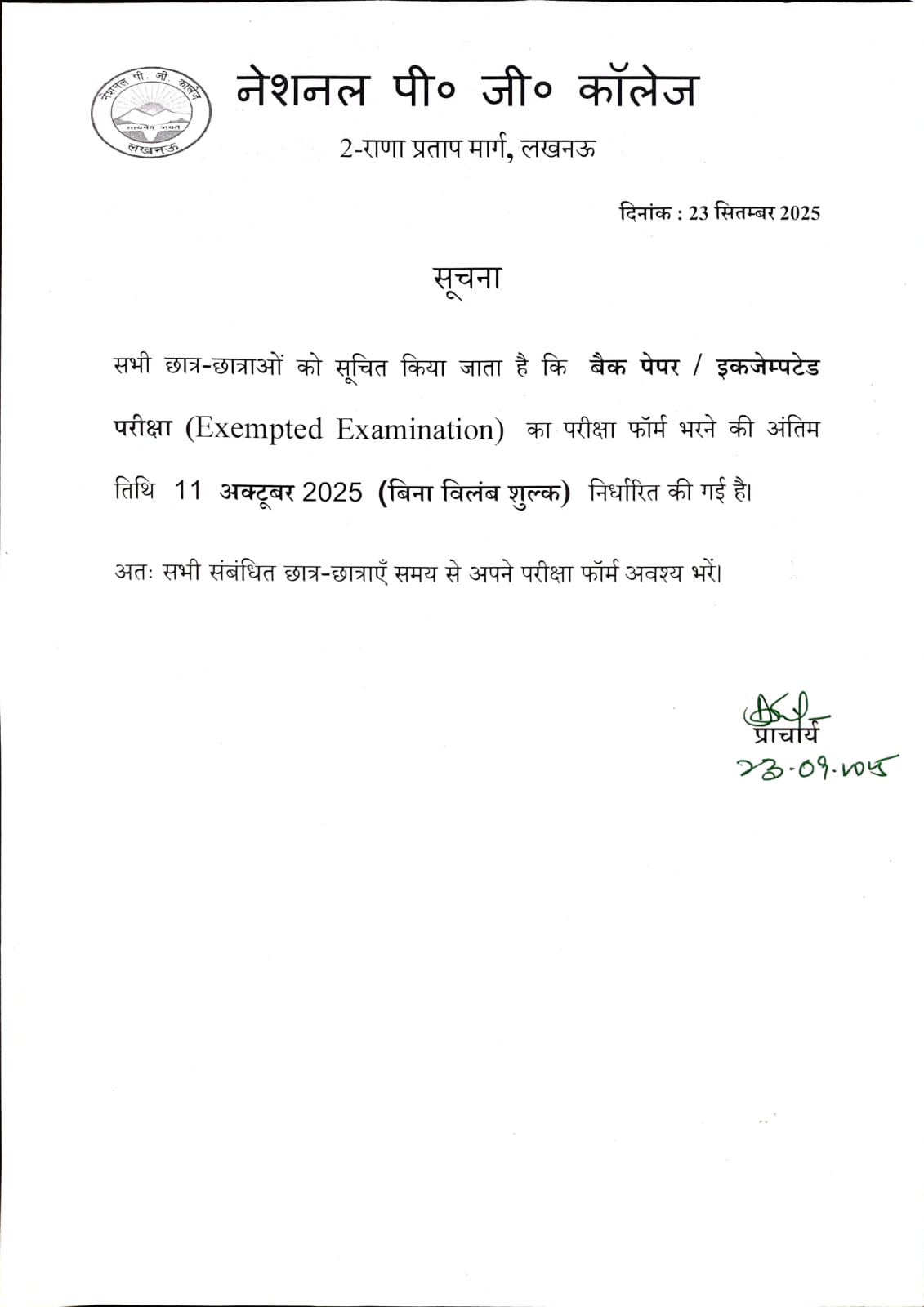 Examination Notice for Back paper & Exempted Students December -2025