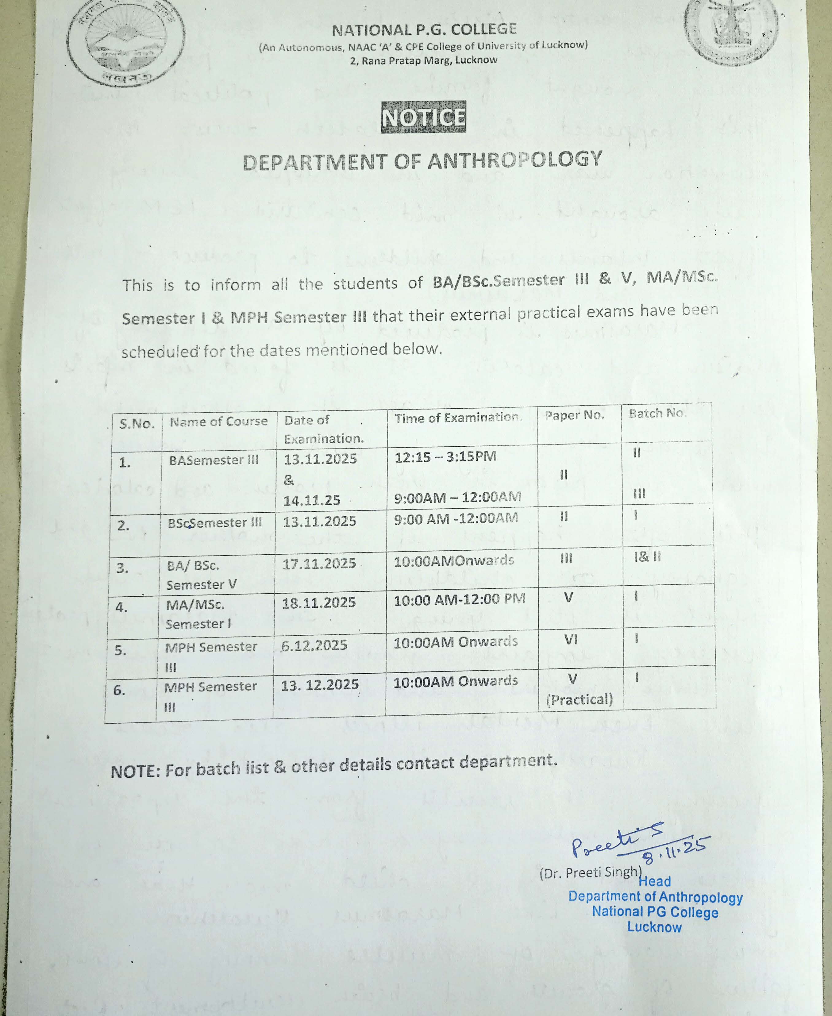 Practical Exam Notice department of Anthropology December - 2025