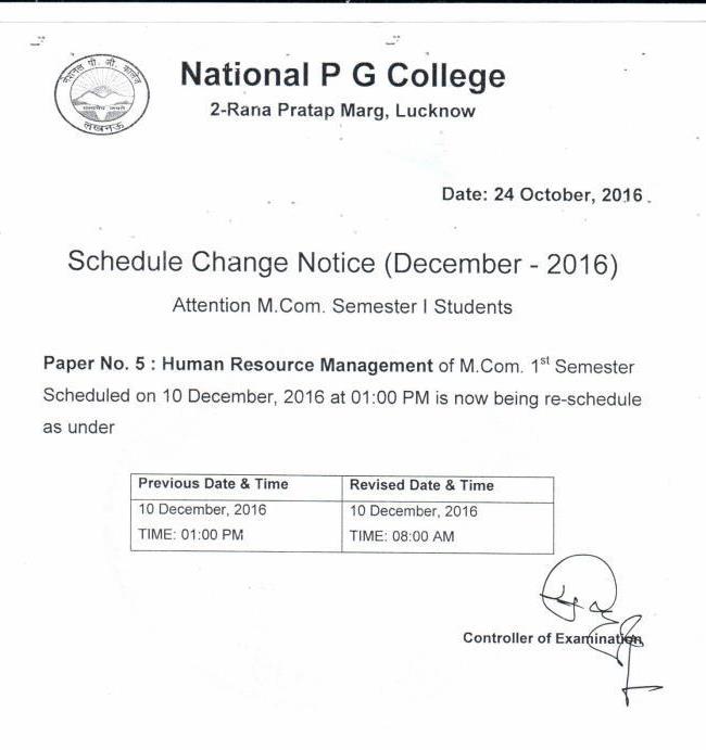 Examination Schedule Change Notice for M.Com - I (December-2016)