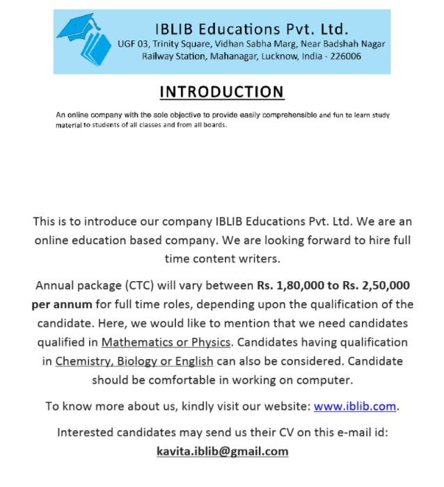 Placement Notice : IBLIB Educations Pvt. Ltd.