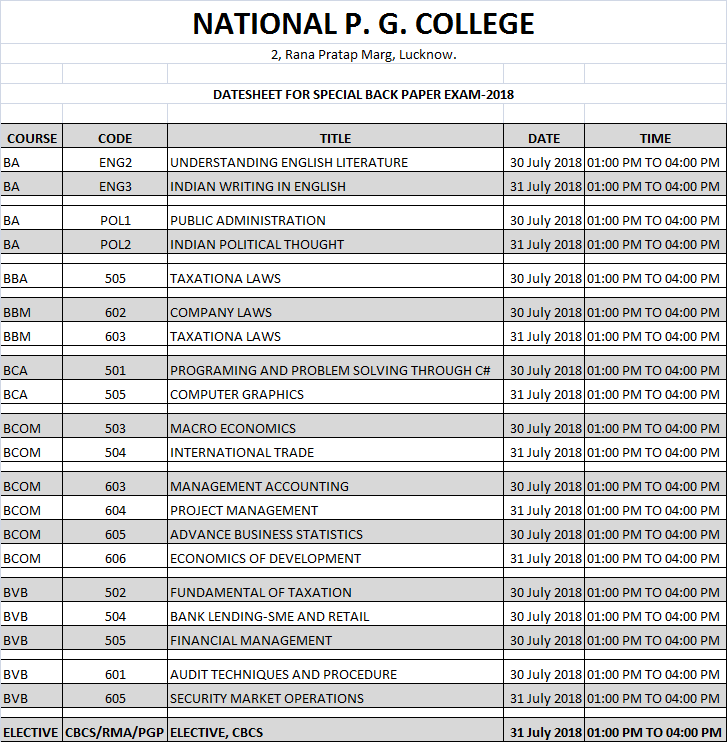 Datesheet Special Back Paper Exam-2018