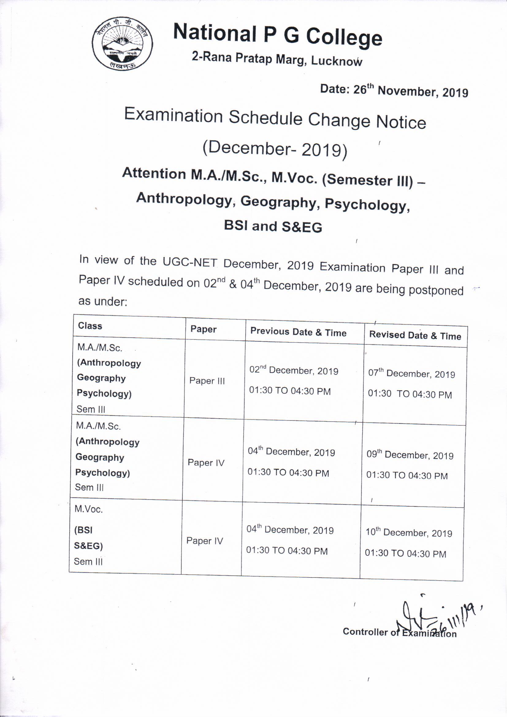 Attention to M.A./M.Sc. & M.Voc. - Schedule Change Notice (Examination Session December-2019) 27 November, 2019