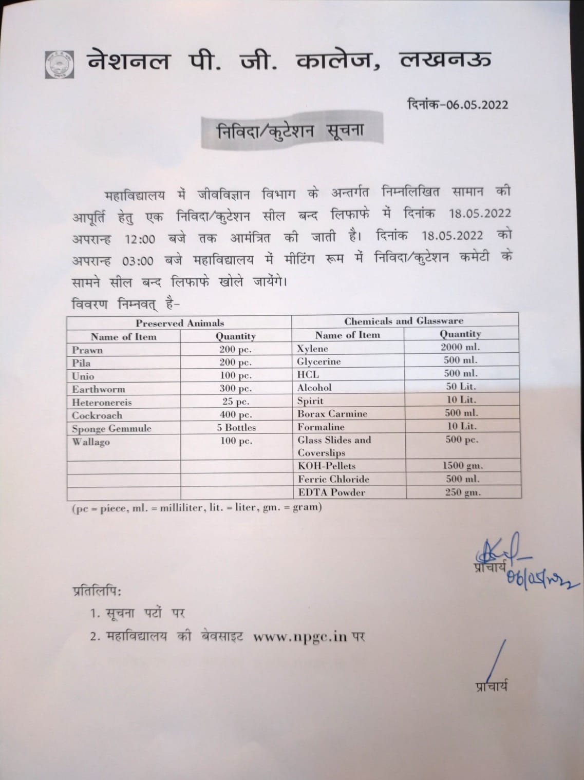Items Required in Zoology Department